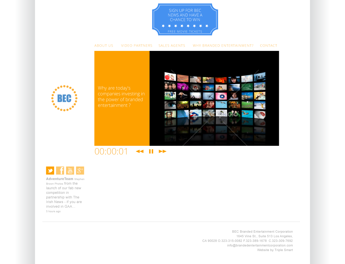 BEC - Branded Entertainment Corporation es la empresa que buscaba un diseño para soportes digitales que se adecue a su reciente logotipo, tambien diseñado por mi. Las primeras imágenes buscan la intención de mostrar una empresa de entretenimiento seria y simple. La última opción fue una alternativa menos arriesgada donde tenia mas posibilidades de ser elegida, pero al final ninguno de estos diseños fue seleccionado.